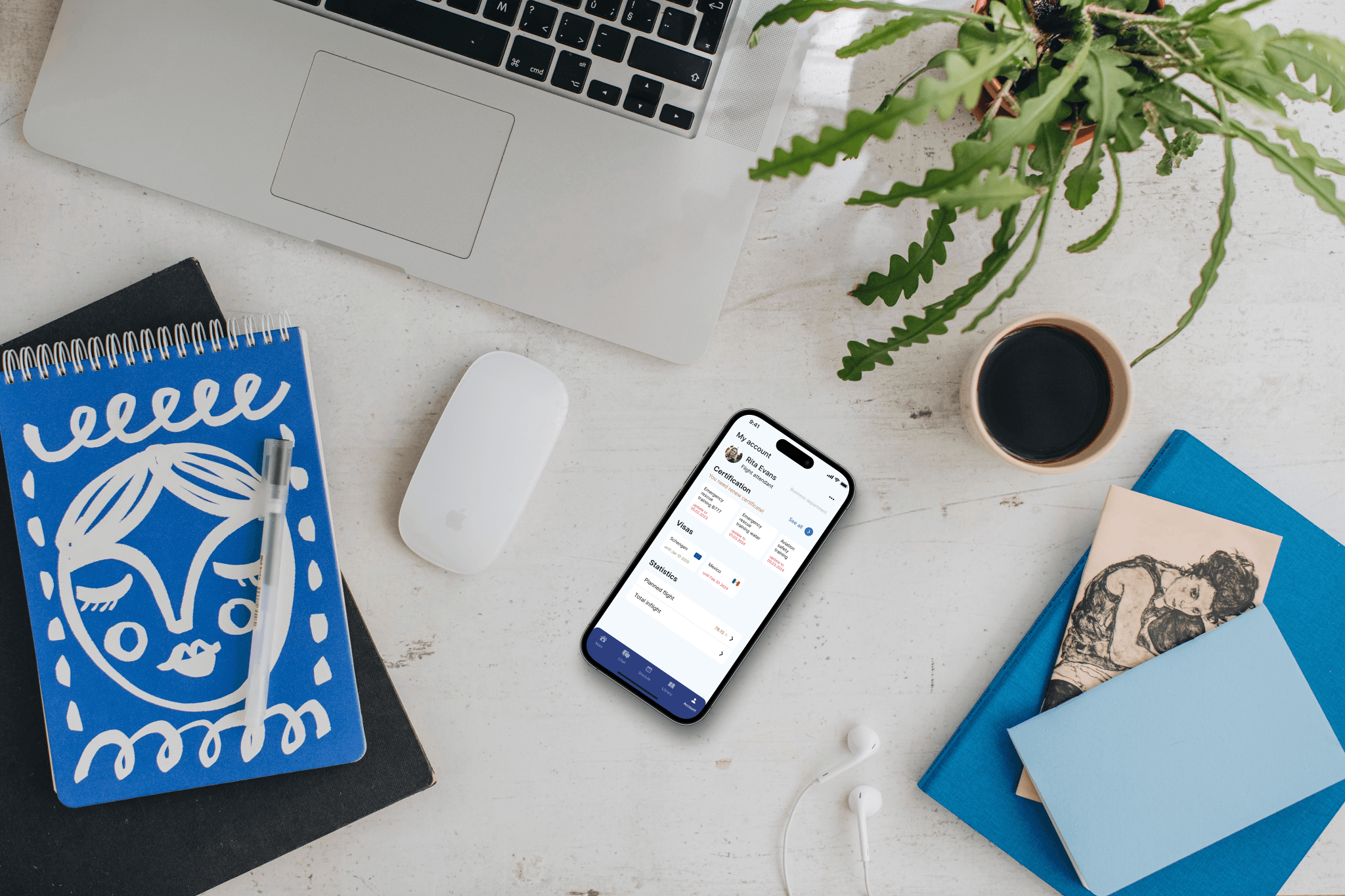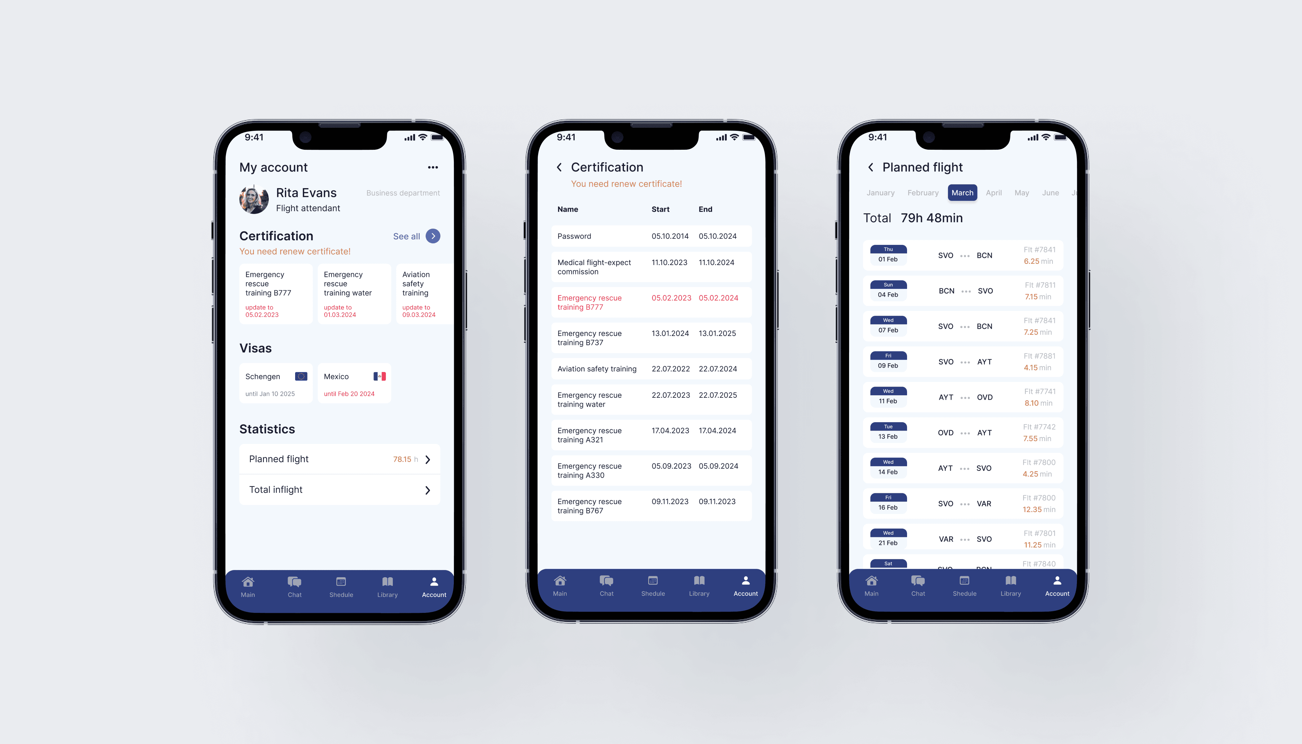 In account, there is all the basic information about the flight attendant. Widgets are available for convenient tracking of certification and visa expiration dates. Additionally, there is an option to see the planned flight hours for the month and the total flight hours accumulated throughout their work with the airline.