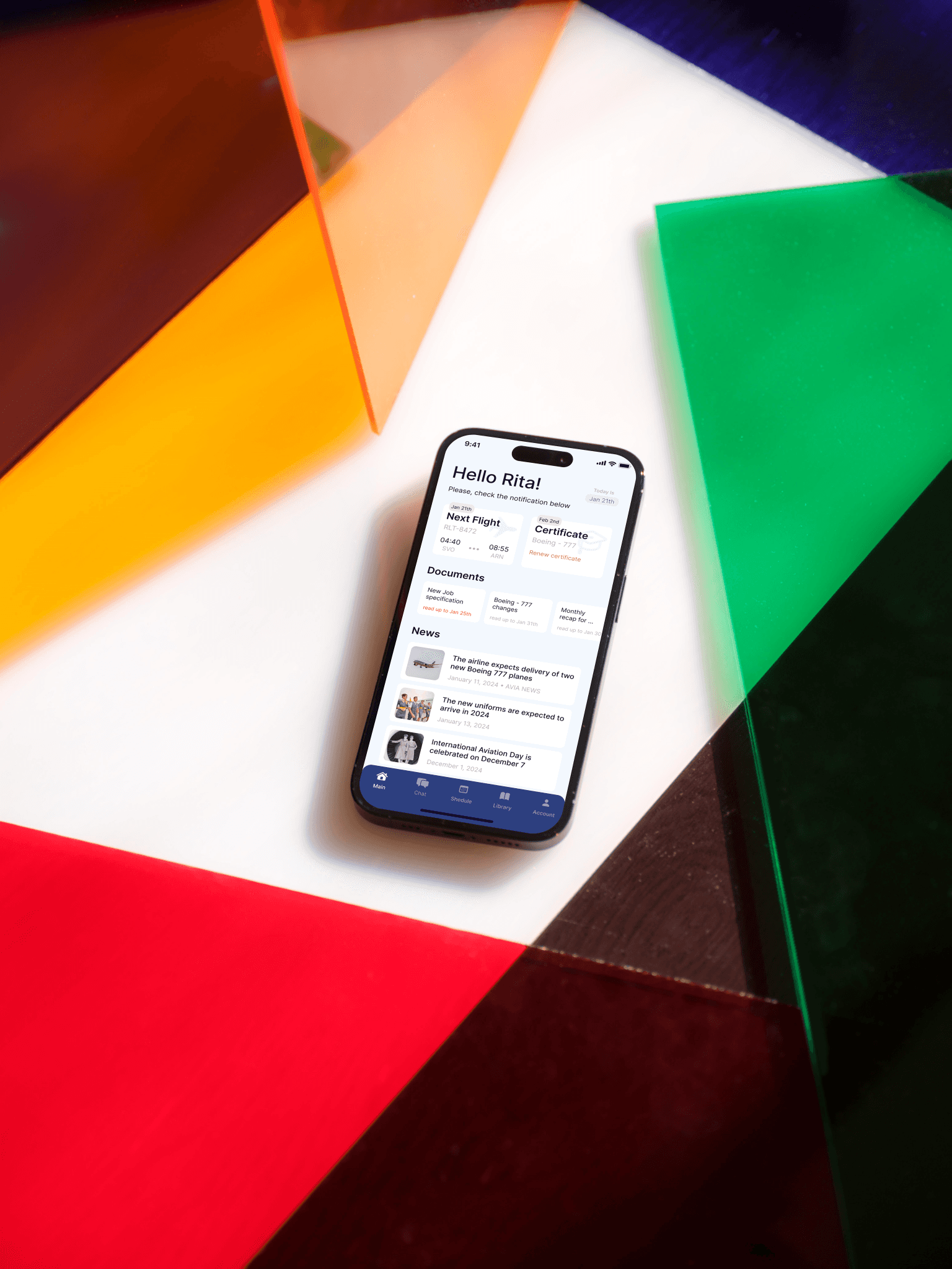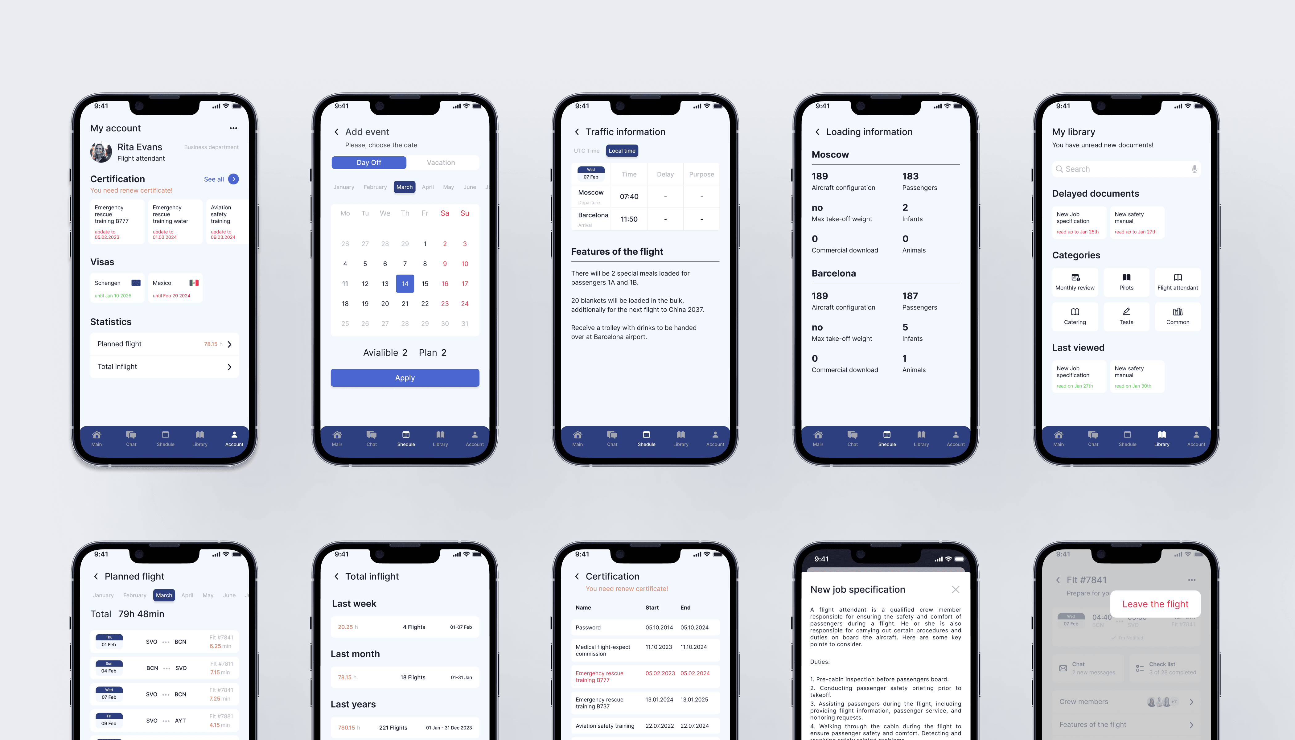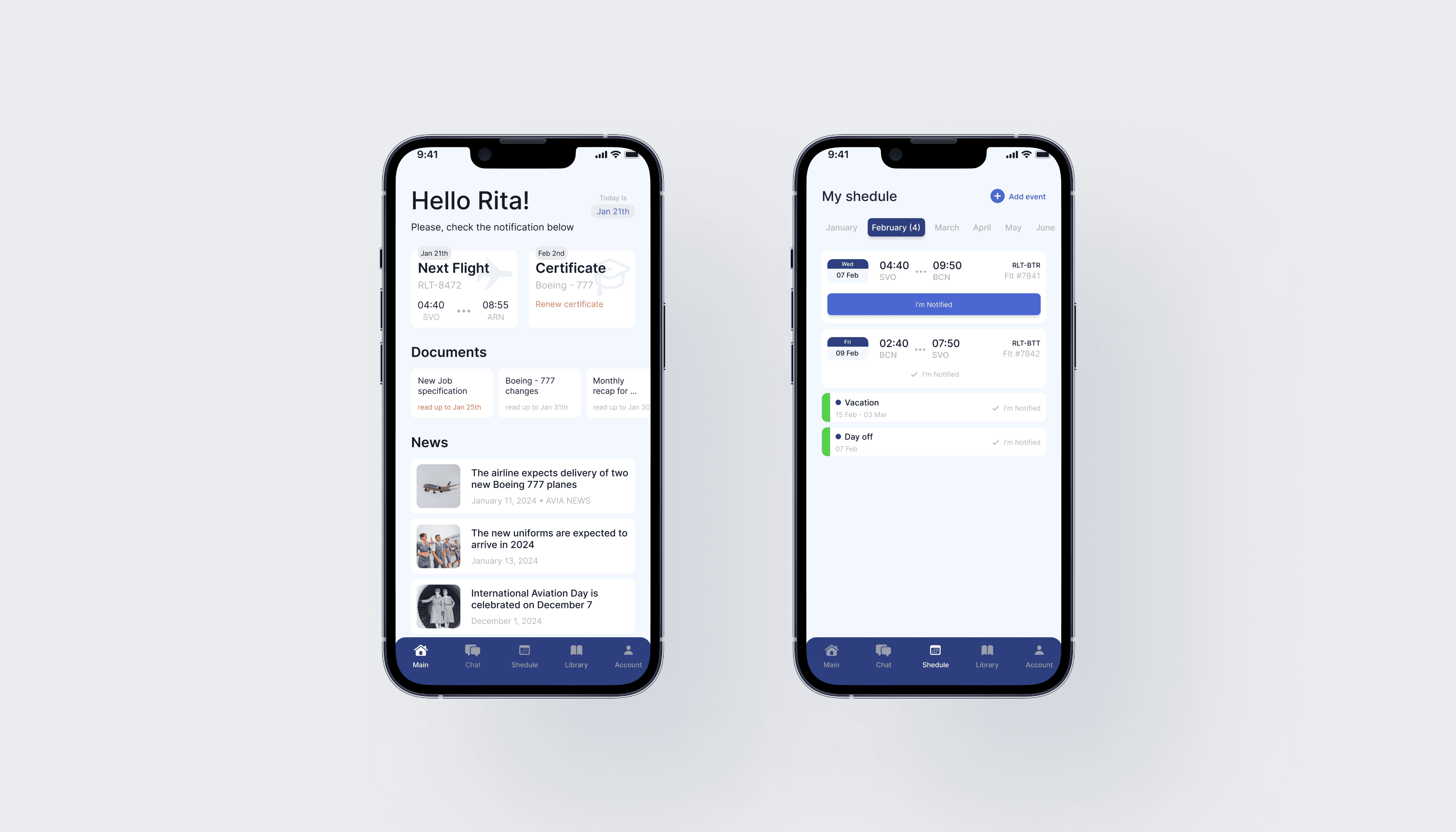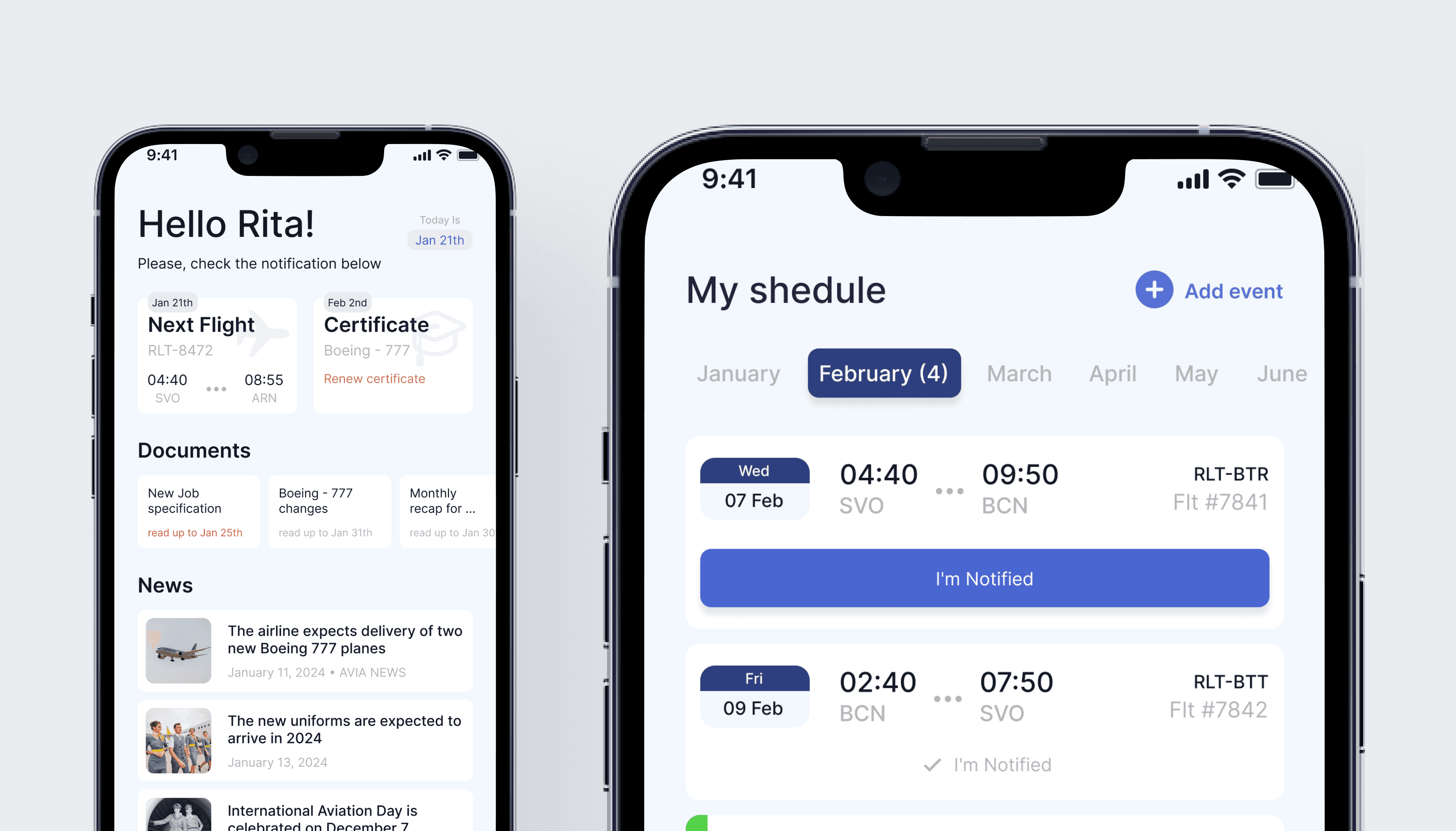 The main screen features convenient widgets that allow you to instantly view all key events, the date of the next flight, unread documents, expiring certifications, and major airline news. On the schedule screen, there is an option to add events independently, such as days off or vacation.