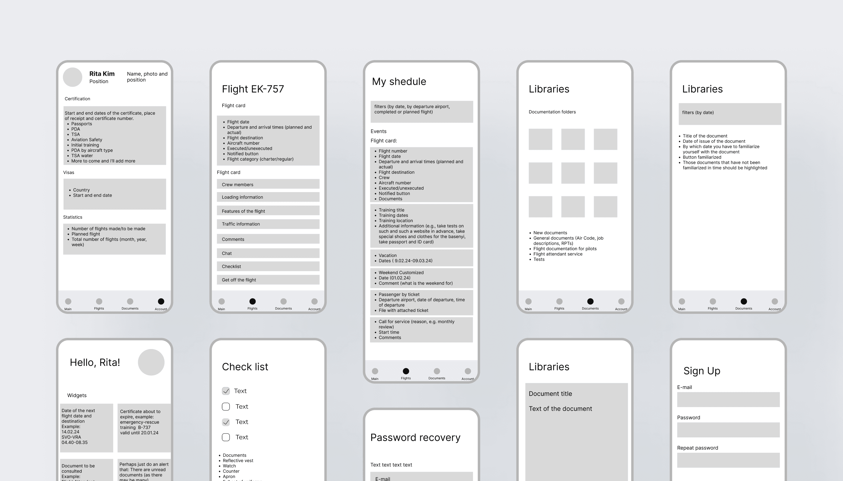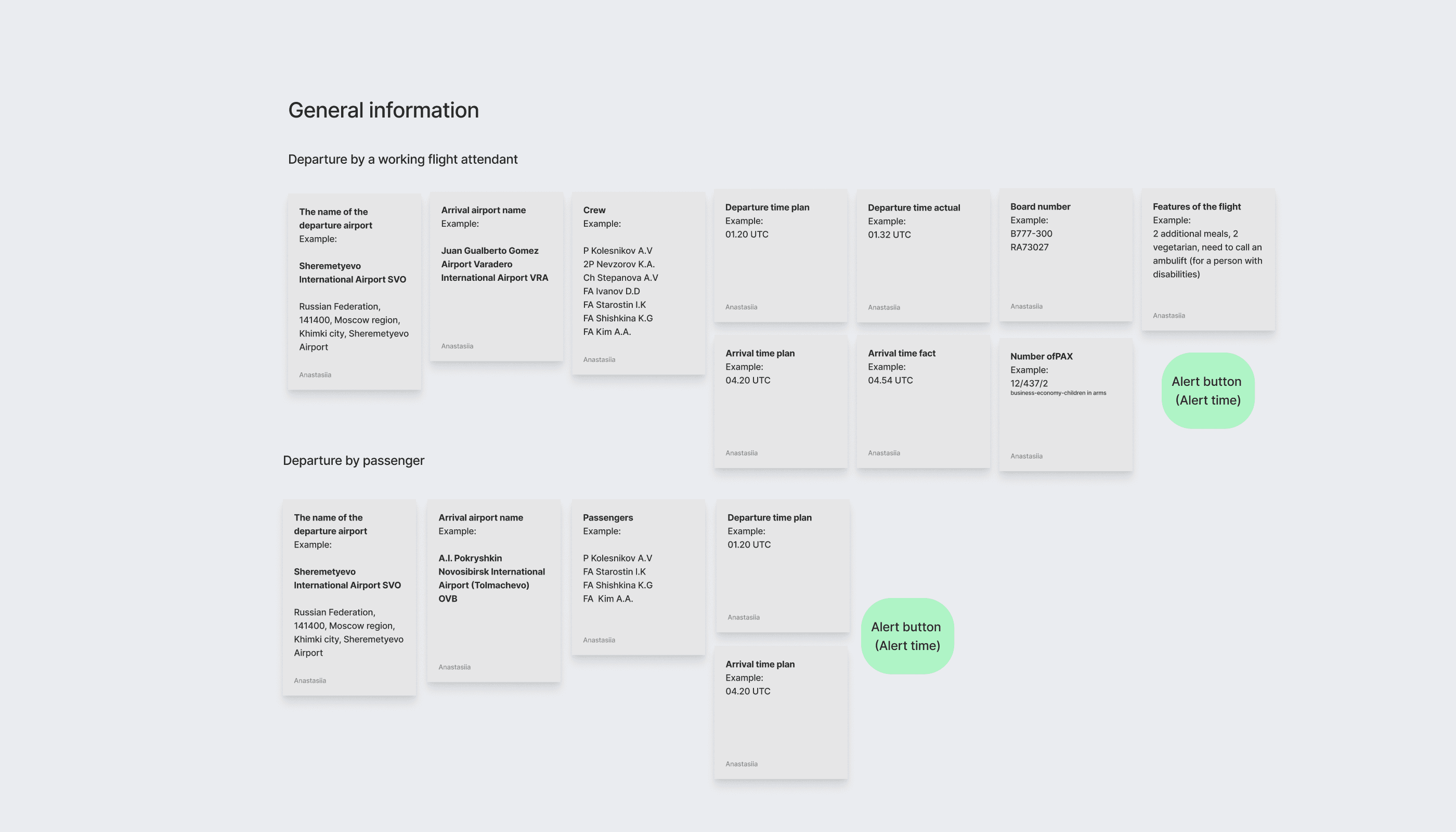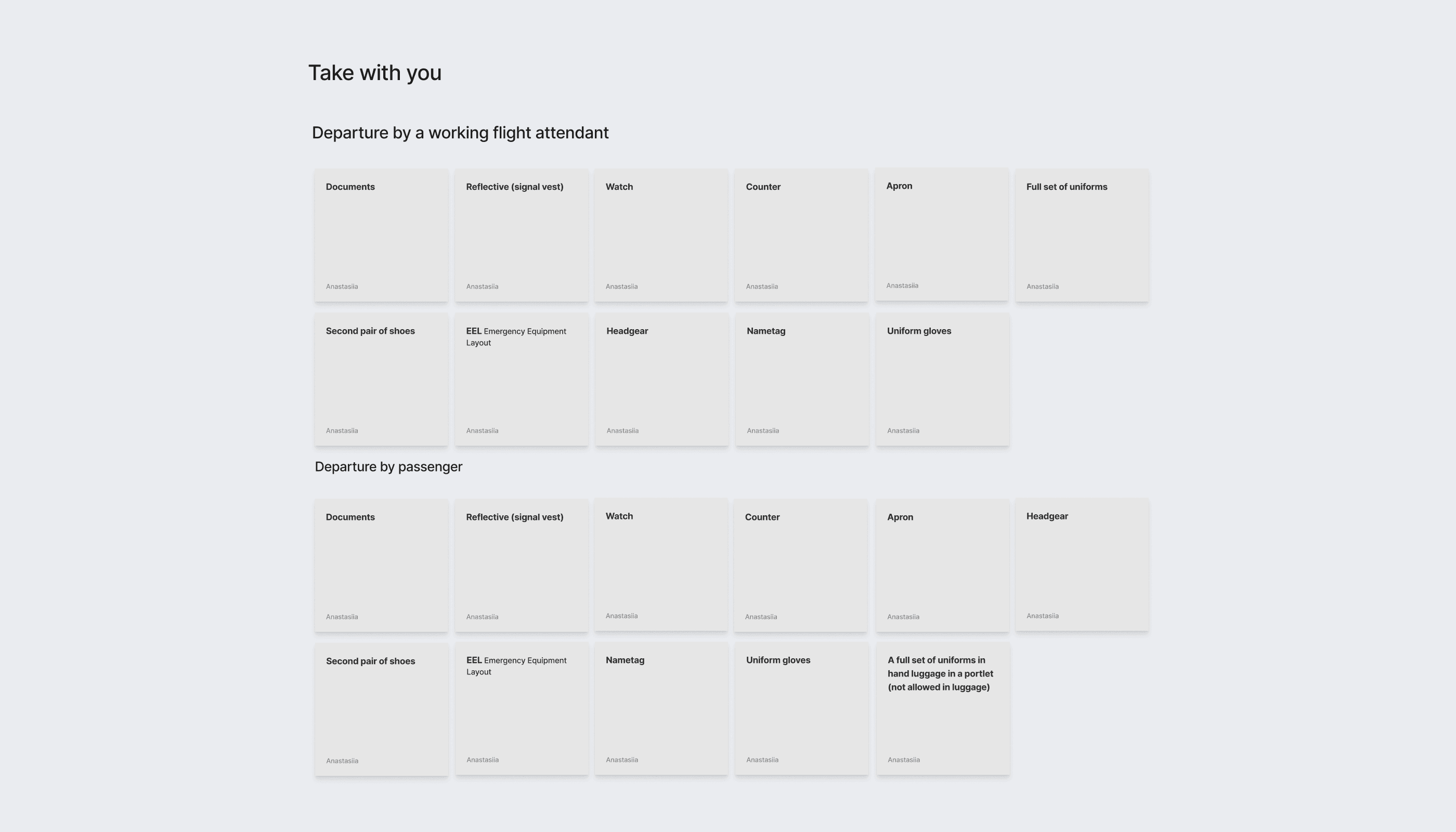 To create this application, I conducted a research to analyze all the main tasks performed by flight attendants. I studied the functionality and design of other flight attendant applications to understand user needs and the main problems they face. This helped me identify key user requirements and areas for improvement in my application. I started by describing all the tasks that flight attendants perform both at home and at work, including their routine duties during flights and the main challenges they encounter daily.