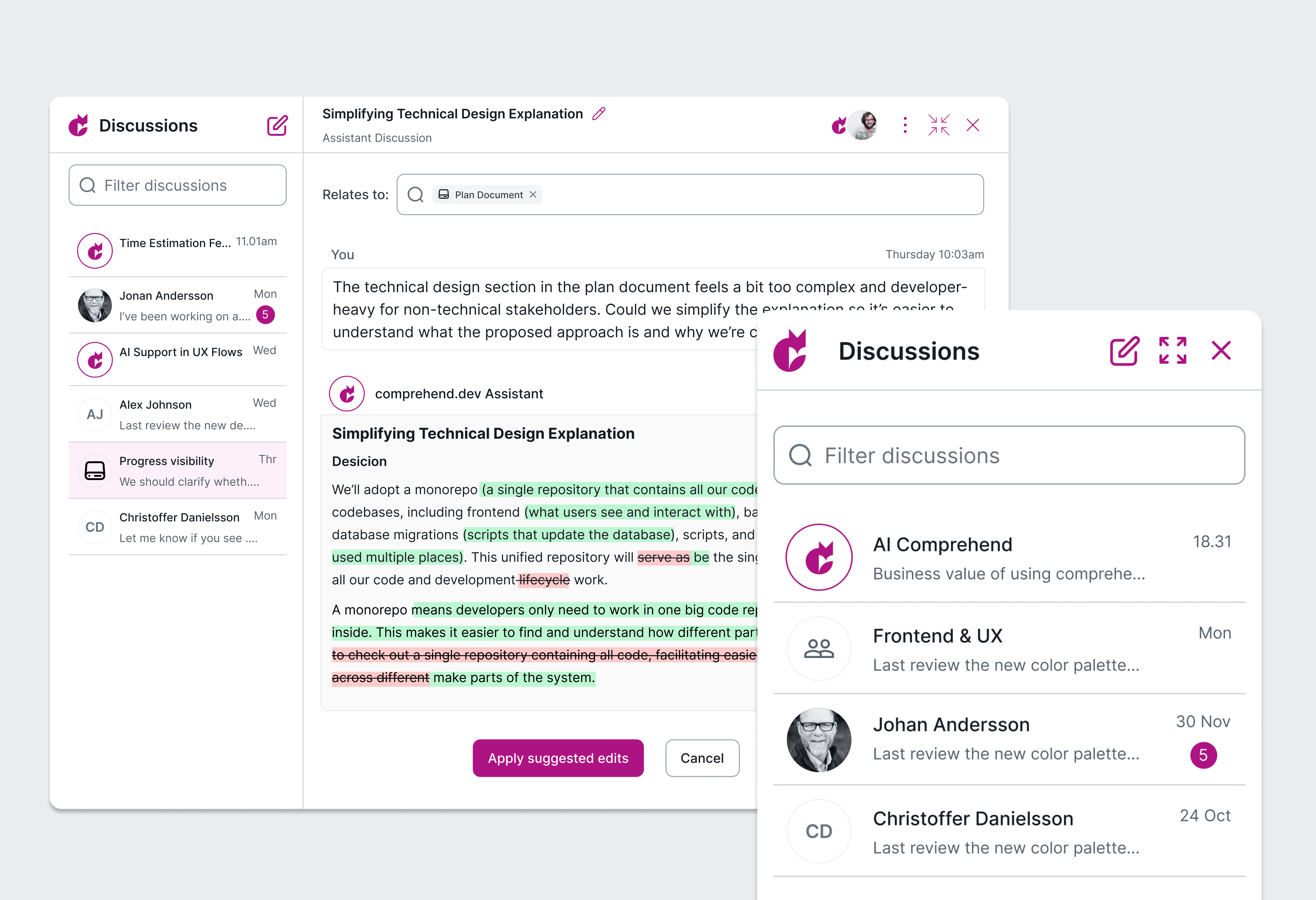 Discussions were redesigned from a basic messaging feature into a contextual, AI-powered tool with three discussion types: Shared, Private, and AI.
