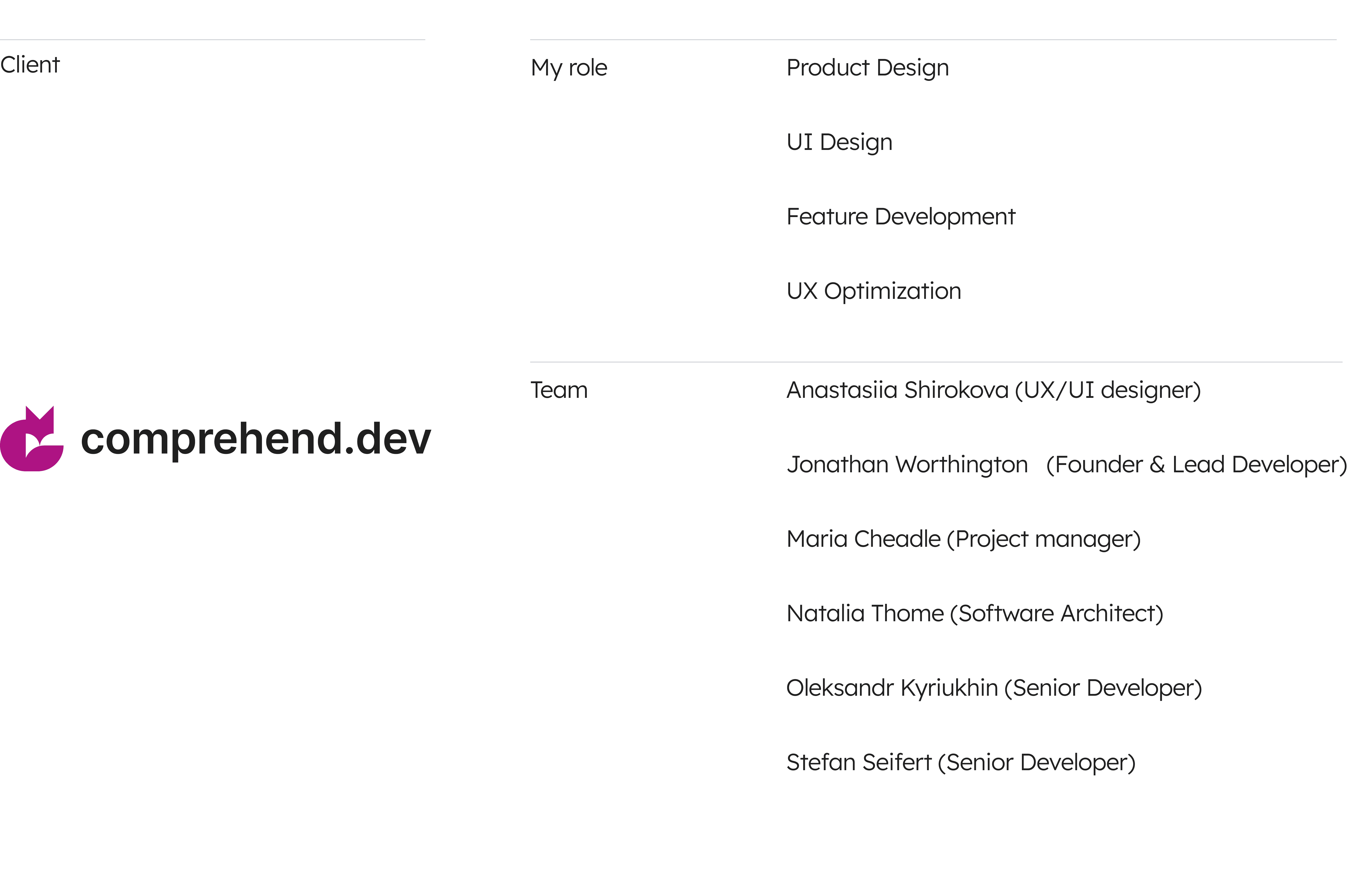 In addition, together with the lead developer I participated in a consulting collaboration with another company, where Comprehend was used in real working conditions. This provided practical validation of the product and helped uncover usability issues and edge cases through real tasks and external workflows.