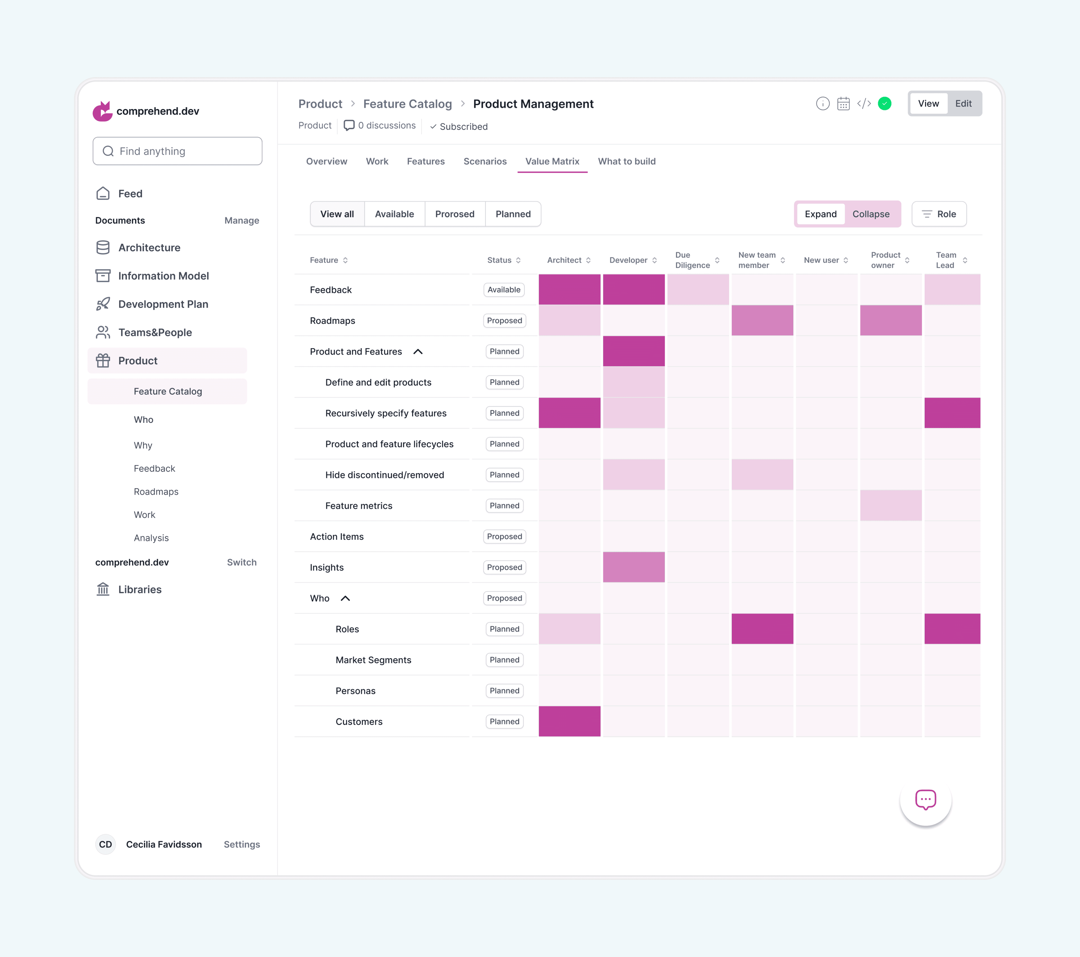 Color intensity indicates the level of involvement, and status labels (Available, Proposed, Planned) show the maturity of each item. This helps users quickly understand ownership, identify responsibility gaps, and see what is already defined versus still in progress.